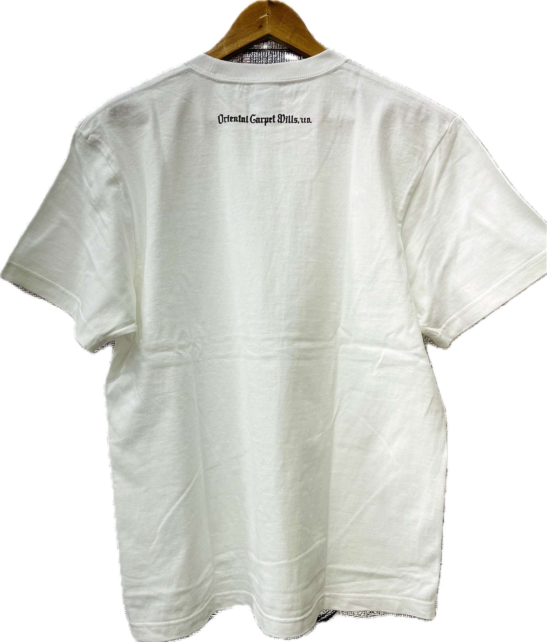 ・ホワイトTシャツには、ダークブラウンでロゴプリント